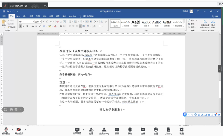本站讯 为发挥毕业生党员的先锋模范作用,站好毕业前的“最后一班岗”,帮助同学们深入了解考研、保研、出国以及就业形势,引导同学们在今后做出合适的选择,6月11日下午,taptap点点体育举办了毕业生党员线上经验分享会。taptap点点体育本科生第二党支部委员魏佳佳主持会议,学院非毕业年级全体学生党员、入党积极分子参加此次会议。