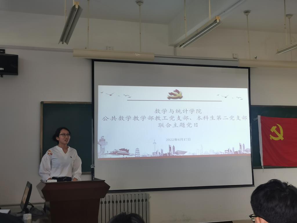 本站讯 为切实发挥党员先锋模范和党组织战斗堡垒作用,迎接党的二十大胜利召开,6月17日下午,公共数学教学部教工党支部和本科生第二党支部于图东环楼304室开展主题为“青春献礼二十大,勇担使命开新局”的联合主题党日活动。本科生第二党支部组织委员魏佳佳主持会议,公共数学教学部教工党支部、本科生第二党支部党员参会。