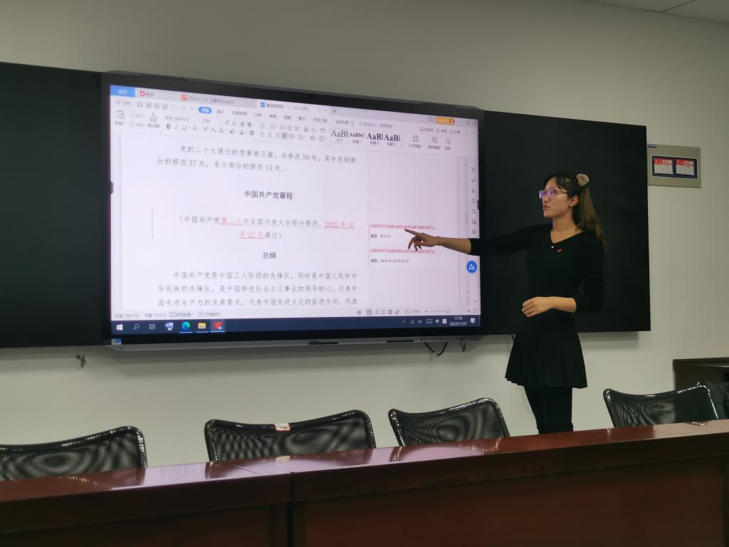 首先,与会党员一起观看视频,进一步学习习近平总书记在中国共产党第二十次全国代表大会上的报告精神。党支部组织委员魏佳佳就支部深入学习贯彻党的二十大精神主题教育活动进行了系统介绍。之后,支部针对新修订的《中国共产党章程》、《中国共产党党旗党徽条例》的有关内容进行了全面细致的学习。孙磊就本次支部活动进行了总结发言,希望党员同志要以身作则,不断推深对党的二十大精神的学习,积极参加支部组织的形式多样的活动,力争做到真学懂、真弄通、真致用。同时,孙磊对日常工作中党旗党徽的使用进行了重点强调,要求支部严格按照规定执行,不得擅自随意使用。