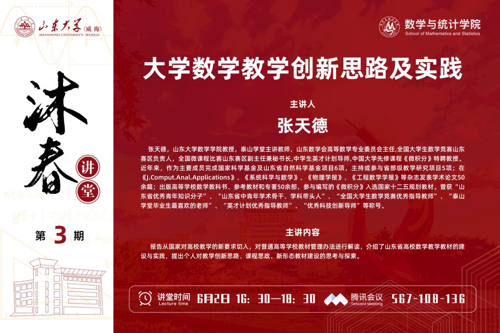 张天德,山东大学数学学院教授,泰山学堂主讲教师,山东数学会高等数学专业委员会主任,全国大学生数学竞赛山东赛区负责人,全国微课程比赛山东赛区副主任兼秘书长,中学生英才计划导师,中国大学先修课程《微积分》特聘教授。