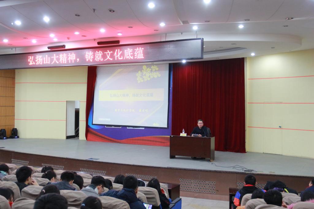 本站讯为增强新生对学校的文化认同,进一步继承和弘扬山大精神,11月20日下午,我院常务副院长、党委副书记綦建刚在玲珑学堂为新生开展“弘扬山大精神,铸就文化底蕴”入学教育主题讲座。讲座由学院新生辅导员王祎璠主持,学院2019级全体新生参加。