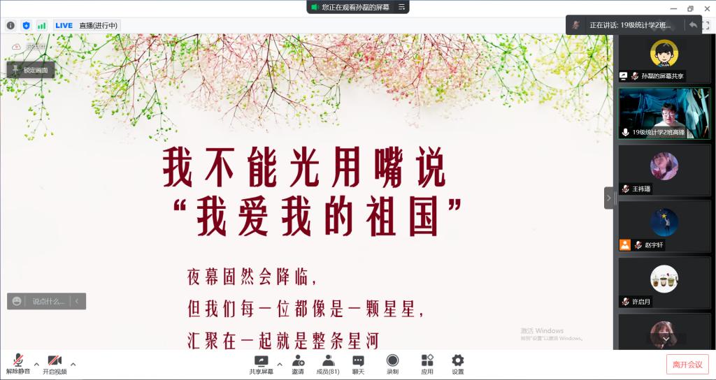 思政课中,在校学生代表讲述了作为一名普通学生感受到的温暖和帮助,表达了对学校、学院细致工作的感谢和理解;志愿者代表分享了投身疫情防控工作的所思所感,如同2019级统计二班班长高锋所说,“我不能光用嘴说我爱我的祖国”。这句话深深触动了大家,而全体师生的众志成城正是对这句话最好的体现,或许夜幕会来临,但我们每个人,都像是一点一点的星光,汇聚在一起,就是整条星河。