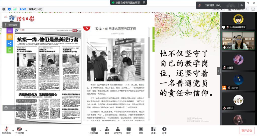 辅导员王紫山、赵宇轩、魏佳佳、王祎璠结合工作实际,从不同角度分享了疫情防控20天里学工一线工作者的心路历程,“守护全体同学健康平安”是他们最大的信念,从他们的讲述中充分彰显了学工队伍的责任与担当。教师代表卢红克服居家困难,精心备课,在保障教学质量、坚守教学岗位的同时,她也尽自己所能,帮助社区工作者汇总物资清单,建立物资台账,她说“疫情当下,尽自己所能,能做一点就多做一点”;而他的先生在烟台白天线上教学,晚上作为志愿者在社区值守,不仅坚守在育人一线,还坚守着一名普通党员的责任和信仰。