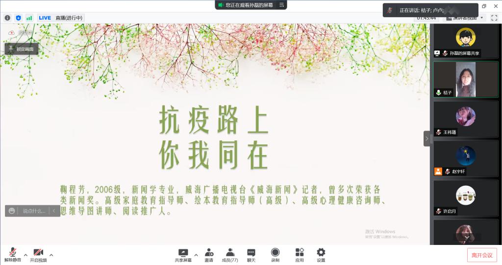 2006级新闻学专业校友鞠程芳作为投身一线的新闻工作者,与大家讲述了她采访报道中高新区市场监管局信用与价格监管科的科长王威荣和西文化社区“祖孙三代齐上阵”的动人故事;同时,她分享了作为一名母亲在舍家返岗的17天里对家庭的思念和愧疚,讲到了她的爱人辅导员孙磊在家中忙碌的真实情境,再现了一位学工人员居家“在线不掉队”的担当作为。2021级数学类专业学生黄玉彤家长,在分享中表达了对学校全体教职医务员工以及后勤保障服务人员的感谢,她表示将始终与学校携手努力,等待“疫”散花开。