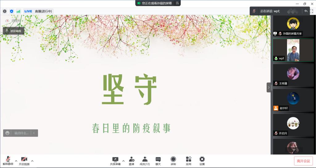 本站讯 疫情防控是一场没有硝烟的战争,更是一堂鲜活生动的思政大课。面对新冠肺炎疫情这场大考,taptap点点体育顺势而为,借势而进,将身边“抗疫”点滴化为思政“新教材”。3月28日晚八点,学院师生通过腾讯会议及直播链接相聚“云端”,开展了一期生动的思政课《坚守——春日里的防疫叙事》。学生志愿者代表、辅导员、专业教师、校友兼教师家属代表及学生家长共11位讲述者,生动再现了疫情防控期间发生在身边的动人故事,分享了这场大考下的经历、坚守与成长。本次思政课堂由学院党委副书记王鹏飞主持,学院全体党政领导、全院师生、部分家长共计600余人在线参与。