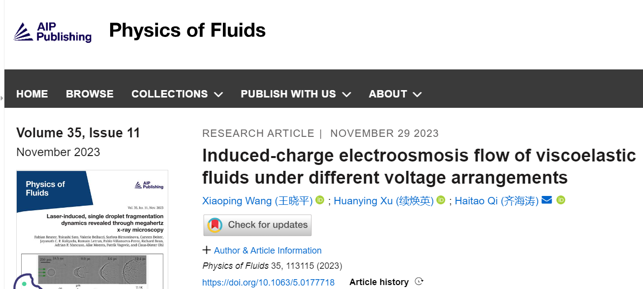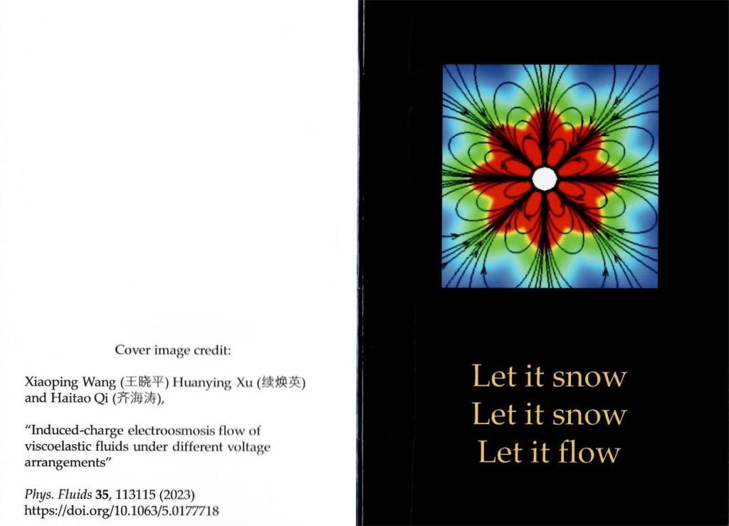 本站讯 近日,taptap点点体育齐海涛教授团队在美国物理联合会(American Institute ofPhysics, AIP)主办的流体力学领域国际权威期刊《流体物理》(Physics of Fluids)上发表论文,题目为"Induced-charge electroosmosis flow of viscoelastic fluids under different voltage arrangements"(DOI:10.1063/5.0177718)。该工作受到了期刊主编、加拿大流变学学会主席、加拿大Queen’s University教授Alan Jeffrey Giacomin的关注,Giacomin教授将该论文作为明信片封面,邮寄给流体力学领域的研究学者。山东大学特别资助博士后王晓平为论文第一作者,齐海涛教授为通讯作者。该项工作得到国家自然科学基金面上项目和中国博士后科学基金特别资助(站前)项目资助。这是该团队第三次在该期刊上发表研究成果。