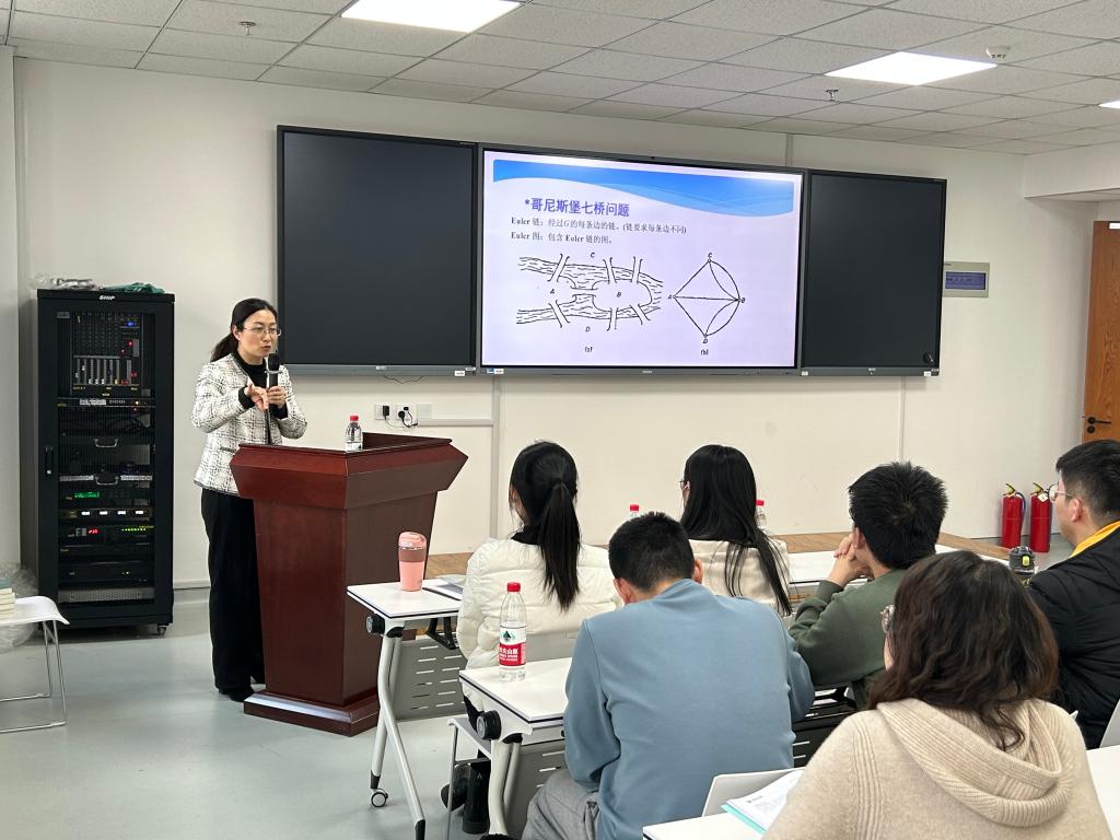 亓兴勤以“伟大的数学家,有用的数学,前途无量的‘我’”为主题,与在场学生展开生动地交流。结合国际数学日的背景,她从“山巅一寺一壶酒”的圆周率π入手,通过介绍圆周率中包含的排列组合以及受圆周率启发的文艺创作,展示了数学的神奇魅力。随后,她以山东大学三大数学奖“大满贯”团队的故事作为切入点,介绍了一系列伟大的数学家不断钻研和探索的故事,生动展现了数学家对科学真理的执着追求和潜心研究的奉献精神。谈到数学的实际应用,亓兴勤指出,数学与生活息息相关,大部分实际问题如图论、博弈、编码等都蕴含着数学知识,这也正是数学建模的魅力所在。交流最后,她以著名数学家华罗庚的座右铭“天才在于积累,聪明在于勤奋”勉励与会学生坚持不懈研究数学,探索数学更多的奥秘。