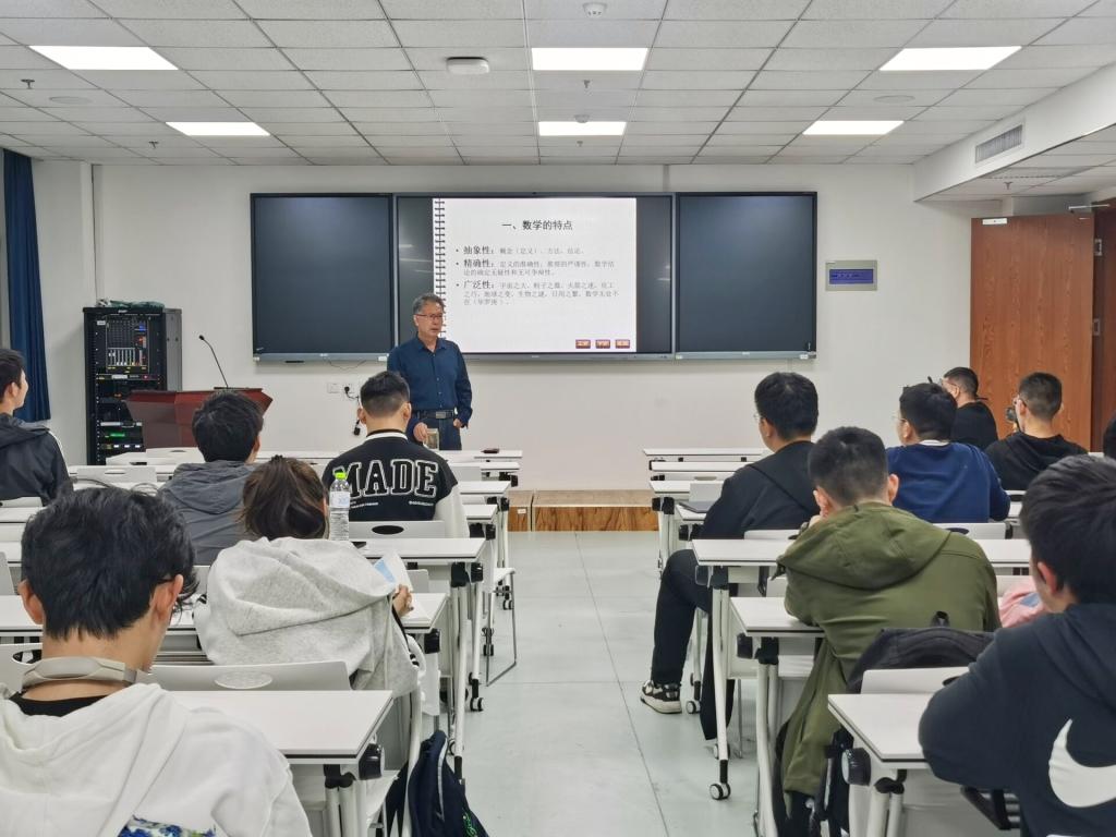 讲座中,綦建刚结合个人大学数学的从教经历,从如何认识数学、如何学习数学两方面讲述“大学数学课程的学习”。他以“数学是什么”作为切入点,引发同学们的思考,并由此从数学特点、数学内容、数学来源和数学构成四个维度讲解如何认识数学。他表示,数学具有抽象性、精确性和广泛性特点,并以数学分析为例说明学习数学要从数学的研究对象、问题、内容、方法、核心理论等方面进行分析。他鼓励同学们通过了解数学原理的发展过程来更好地理解数学理论,并强调了概念与基本假设在数学构成中的重要性。对于如何学习数学,綦建刚指出要整体把握数学理论、弄清其理论核心、了解理论来源、发展过程和理论应用;要重视数学概念,理解概念定义的本质;要通过理解逻辑的特点来熟练运用逻辑推理等等。讲座最后,綦建刚勉励与会同学潜心向学,保持定力,力戒浮躁,以把“冷板凳”坐热的心态面对数学学习和数学研究,立志为解决“卡脖子”技术难题而不懈努力。