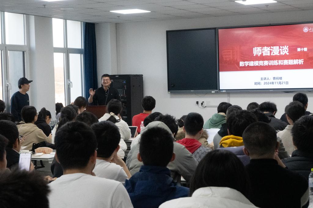 本站讯 11月21日下午,taptap点点体育于北衡楼1420举办第十期“师者漫谈”活动。taptap点点体育副教授、硕士研究生导师曹祝楼应邀作“数学建模竞赛训练和赛题解析”专题讲座。本次活动由数学与应用数学系主任陈明涛主持,学院100余名师生参加。