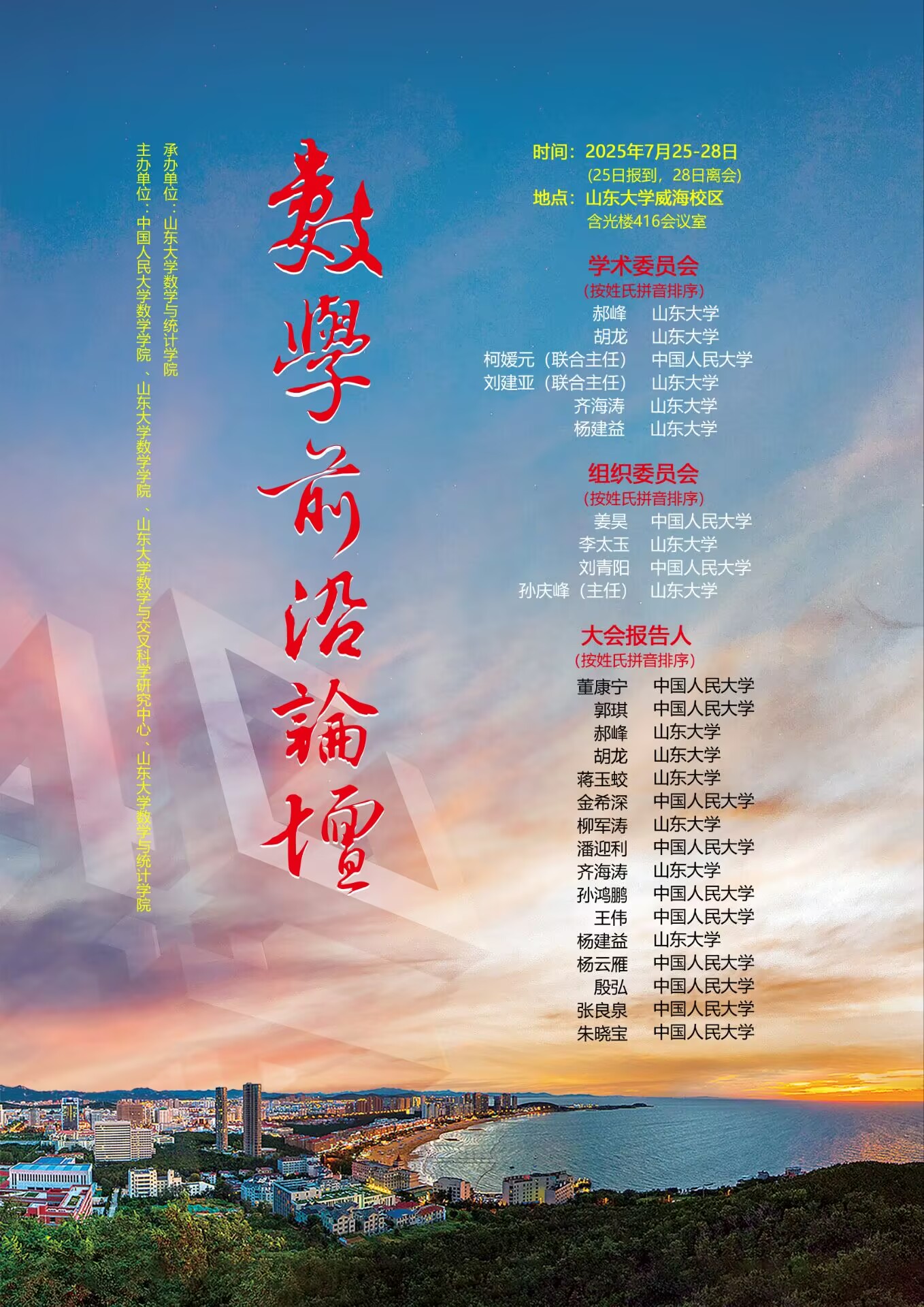 山东大学副校长、威海校区校长刘建亚,中国人民大学数学学院党委书记、副院长柯媛元出席开幕式并分别致辞。在为期三天的论坛中,共举办16场高水平学术报告,来自中国人民大学、山东大学的姜昊教授、张庆彩教授、王伟教授、杨云雁教授、袁勇教授、杨建益教授、胡龙教授、郝峰教授、齐海涛教授、孙庆峰教授等60余位专家学者参与相关学术活动。