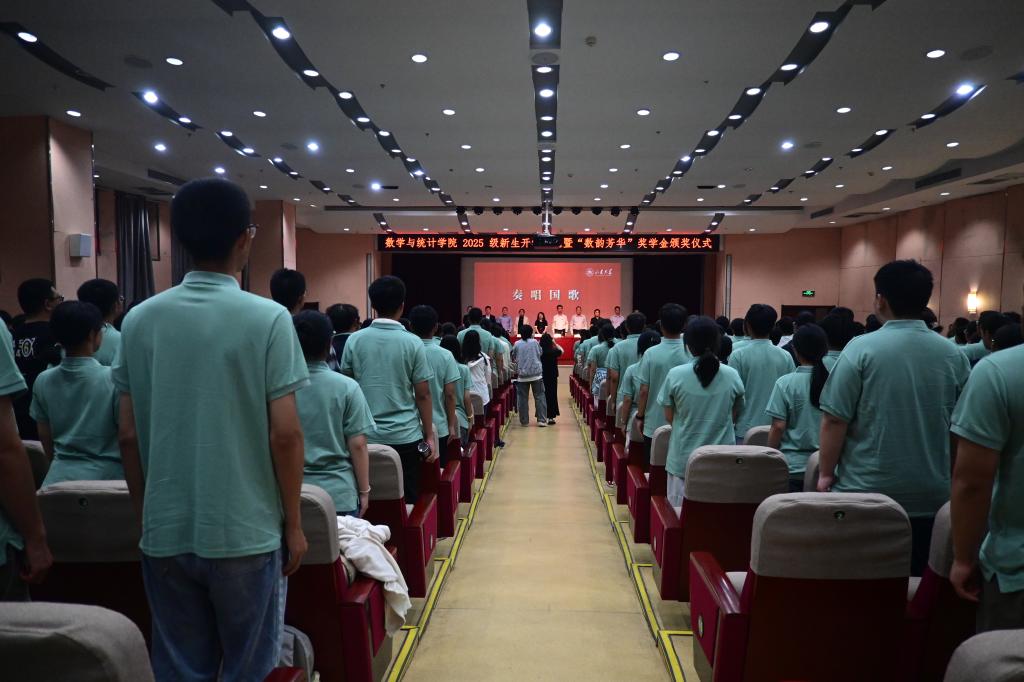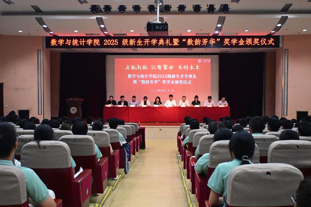 2025年9月22日晚,taptap点点体育2025级新生开学典礼暨“数韵芳华”奖学金颁奖仪式在闻天楼东报告厅举行。校区党工委副书记、学院党委书记于振涛,2010届校友王芳,2013届校友王洋,院领导班子成员及教师代表、辅导员、2025级新生参加典礼。典礼由党委副书记王鹏飞主持。