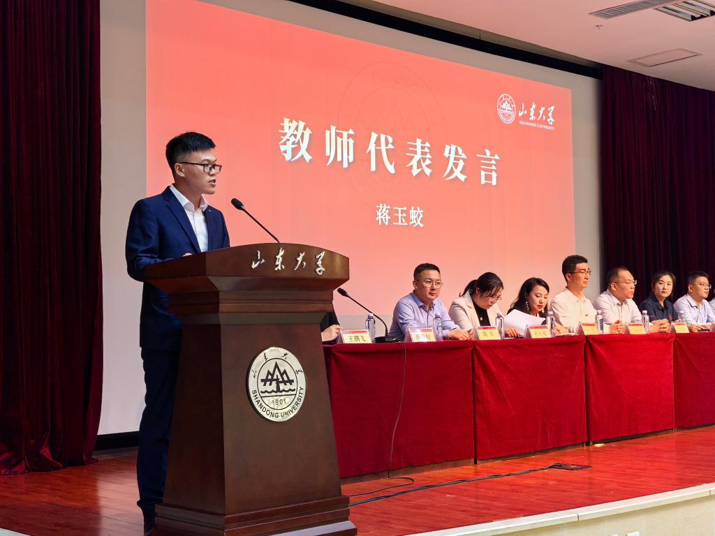 教师代表、国家级青年人才蒋玉蛟以自身的经历和生动的案例鼓励新生深入探索数学之美和逻辑之妙,勉励同学们积极交流,相互碰撞思想火花;勇敢提问,勇于触及问题本质;强身健体,以积极豁达之态迎接未来的挑战。