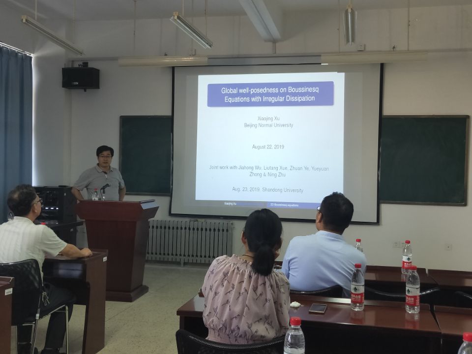 本站讯 8月23日,北京师范大学许孝精教授应邀来我院进行学术交流,并在学院304报告厅做了题为“The well-posedness for the 2D Invisid Boussinesq equations with fractional diffusion in bounded domain”的学术报告,学院部分师生聆听了报告。