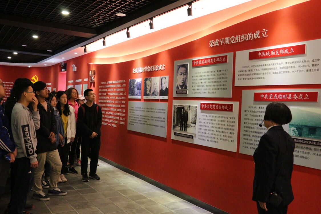 龙山革命纪念馆通过《火种》、《唤起》、《奋战》、《奉献》、《丰碑》五个展厅向来访者展示了荣成革命史和以汪口蹈海七烈士为代表的英雄群体事迹。随着一段段事迹,一段段影像的展开,一位虽有白发却精神矍铄、声音慷锵、身板笔直的介绍员将荣成的红色记忆对我们缓缓道来——日军残忍的入侵,给原本安详的荣成带来了深重的伤害,但是在暴行面前,荣成人民没有屈服,反而展现了强盛的生命力,正是一批又一批无畏牺牲的共产党员用鲜血激励着荣成人民奋勇斗争。从介绍员哽咽的介绍中,仿佛可以窥见当时战火纷飞残酷抗争中,荣成涌现的英雄儿女们精忠报国,将星璀璨,烈士们壮志凌云,英魂永存!荣成人民顽强抗争事迹表现出的无私奉献、以身许国精神深深地感染着在场的每一个人,师生们在参观中有所启悟。参观完展馆之后,全体师生们来到广场合唱红歌《没有共产党就没有新中国》,并在纪念碑前合影。随后全体师生来到了谷牧旧居,感受胶东传统民俗风情,缅怀革命先辈谷牧,在参观学习中继承开放精神,致敬传统文化。