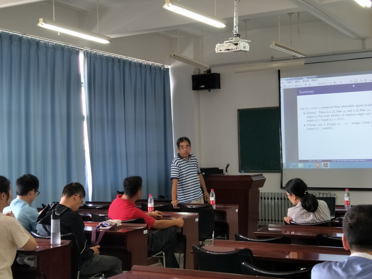 本站讯 2018年6月15日,美国西弗吉尼亚大学(West Virginia University, USA)数学系罗荣教授应邀访问我院院,开展了题为“Integer flows and modular flows of signed graphs”的学术报告,学院部分师生参加了此次报告会。