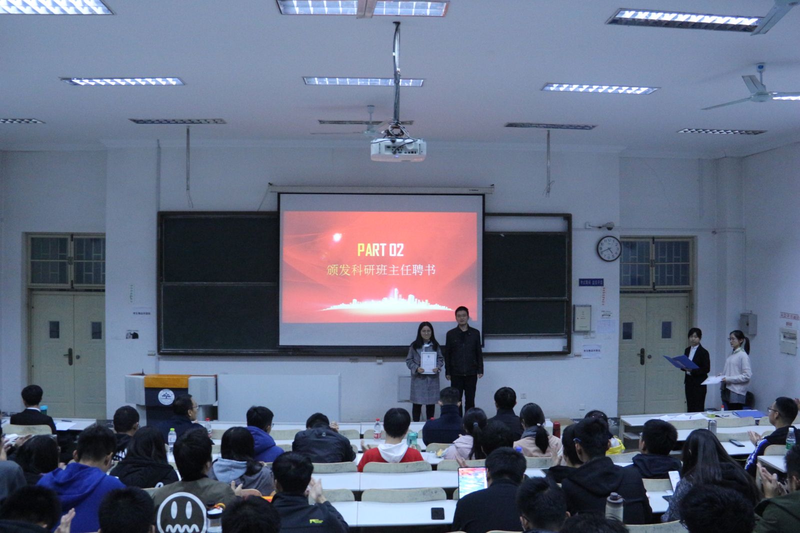 活动伊始,科技学术部部长罗荞荞公布学院第十二届科研班主任名单及其个人基本情况、学院对本届科研班主任授课监督机制,总结往届学院科研班主任成果,提出本届科研班主任目标。活动第二阶段,到场嘉宾分别为第十二届科研班主任颁发聘书并合影留念。颁奖后,第十一届与第十二届科研班主任代表进行发言,讲述了对其工作的总结与展望。活动最后,赵呈海代表2018级数学与应用数学新生发言,提出自身对科研的理解和经历,以及对第十二届科研班主任的期望与建议。
