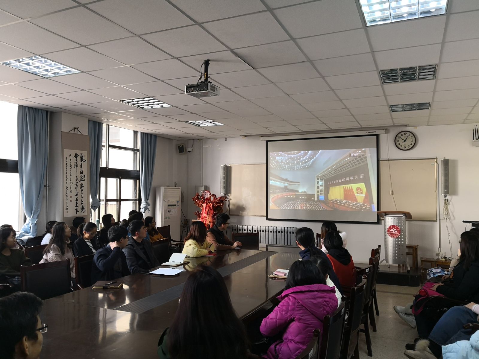 本站讯 12月18日上午10时,在庆祝改革开放40周年大会隆重召开之际,我院于图东环楼208会议室组织师生党员集体观看了大会直播。
