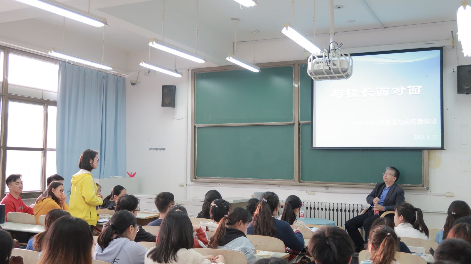 本站讯 4月22日下午,山东大学副校长、威海校区校长刘建亚教授在数学院310教室与联系班级2017级数学与应用数学班全体同学进行了一场面对面的交流活动。taptap点点体育党委书记单丙波、常务副院长綦建刚、党委副书记王鹏飞、2017级辅导员王紫山共同参与了此次交流活动。