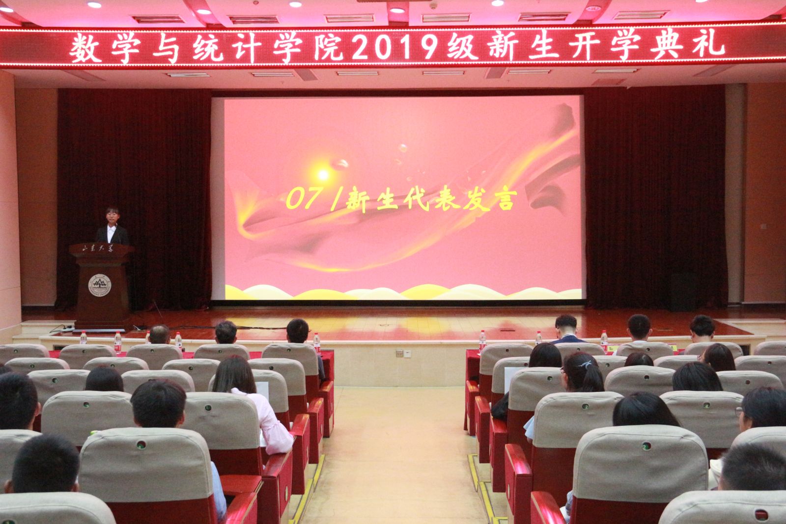 开学典礼在庄严的国歌声中拉开帷幕。常务副院长、党委副书记綦建刚代表学院致辞,他对全体新生表示热烈的欢迎与祝贺,并为大家介绍了学校和学院的基本情况,强调了数学作为基础学科的重要性与发展前景。綦建刚从“何为大学”的问题出发,结合山东大学“为天下储人才,为国家图富强”的办学宗旨,殷切期望全体新生树立“大我”的爱国情怀,将“小我”的人生目标融入“大我”之中,用积极主动的态度、知难而上的勇气投身实现中华民族伟大复兴的中国梦。教师代表、信息与计算科学系主任张旭,结合自己的学习经历,告诫同学们要扎实学习、打好数学基础,切勿急功近利,同时要树立远大理想,脚踏实地去奋斗。随后,老生代表2017级数学与应用数学专业学生魏佳佳发言,表达了对新生的祝福,并分享了自己大学生活的感悟,鼓励新生懂得坚持、不断进取,为自己的梦想而奋斗。新生代表王肖晴表达了对学院教师、学长学姐的感谢与祝福,表明新生定会不负众望,努力奋斗,立志成为山大的骄傲。