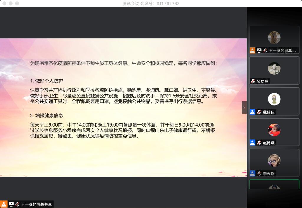 会上,为进一步激发广大同学的爱国主义情怀、弘扬抗疫精神,学院邀请艺术学院2019届毕业生,挂职于枣庄滕州市南沙河镇北池村的张达做专题报告,张达结合个人经历分享了应征入伍的部队生活和投身疫情防控工作第一线的工作感悟,他的报告,展现了大学生退役士兵的风采,传递了枣庄市防疫先锋“发现榜样”人物抗疫模范力量。张达的讲述,使学院学子深刻感受到了彰显在每一位防疫一线工作者身上的抗疫精神,深刻认识到了当代青年的责任担当和青春力量,树立了良好的先锋形象。随后,学院通过视频展现了我院抗疫一线学生志愿者的先进事迹,赞扬学院每位学子居家隔离、坚守岗位、共克时艰、同心抗疫的爱国担当。