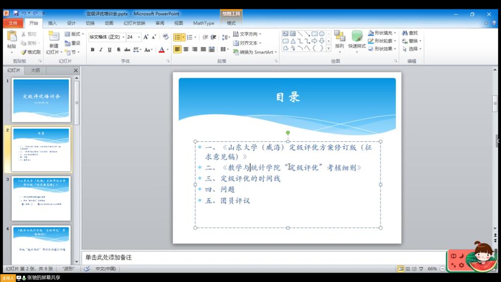 会议伊始,张驰介绍了本次会议的主要内容,强调定级评优工作的重要性,突出了山东大学一校三地统一进行定级评优工作的改变。会上,张驰向全体与会人员详细介绍了定级评优工作的评审规则、流程及相关事项等,包括上交审核材料时需要注意的格式问题等相关内容,并说明了即将到来的三月份定级评优工作的时间线。之后与会人员进行了工作交流,部分班长团支书提出了自己的疑问,张驰一一进行了详细的解答。最后,张驰介绍了包括评议步骤、评议标准等团员评议工作的相关内容。