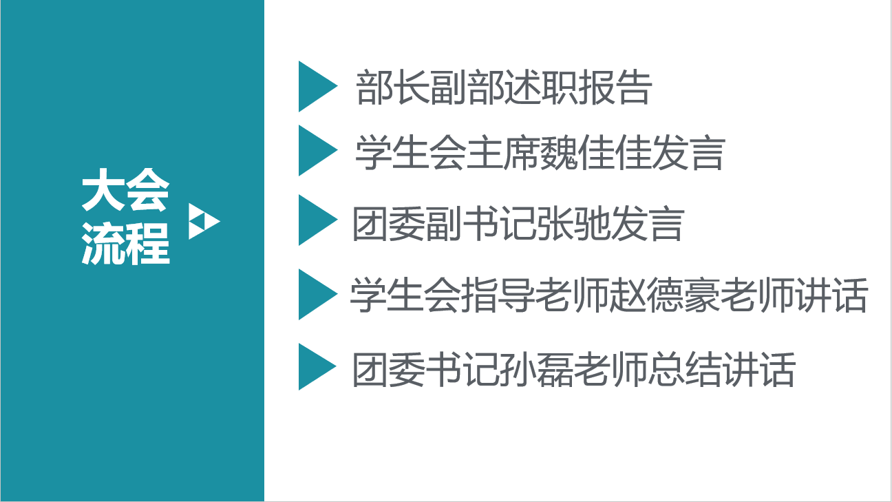会议伊始,主持人向全体同学介绍了本次大会的流程,并宣布会议开始。首先,各部门部长做述职报告,介绍上学期的工作,总结获得的成绩以及发现的问题,并汇报本学期的工作计划。接着,学生会主席魏佳佳发言,肯定了学生会各部门的工作,指出大家在疫情期间也要配合学生工作,弘扬自身优点并转化为自身能力。团委副书记张驰发言,回顾并对团学中心各部门的工作表示认可,强调大家应团结一致,并肩前行,言论严谨,严格要求,做好时间规划。之后,赵德豪与大家进行了交流,指出学生干部首先要做好学生的本职工作,疫情期间坚守自己的本心将在家学习生活当做提升自我的契机而不是逃避的借口,要以积极饱满的心态,为同学服务的态度执行工作,收获成长。最后,孙磊总结讲话,强调应把握工作方向,明确工作目的,对学生组织成员的身份有认同感,在工作中呈现出的问题要有总结与反思。
