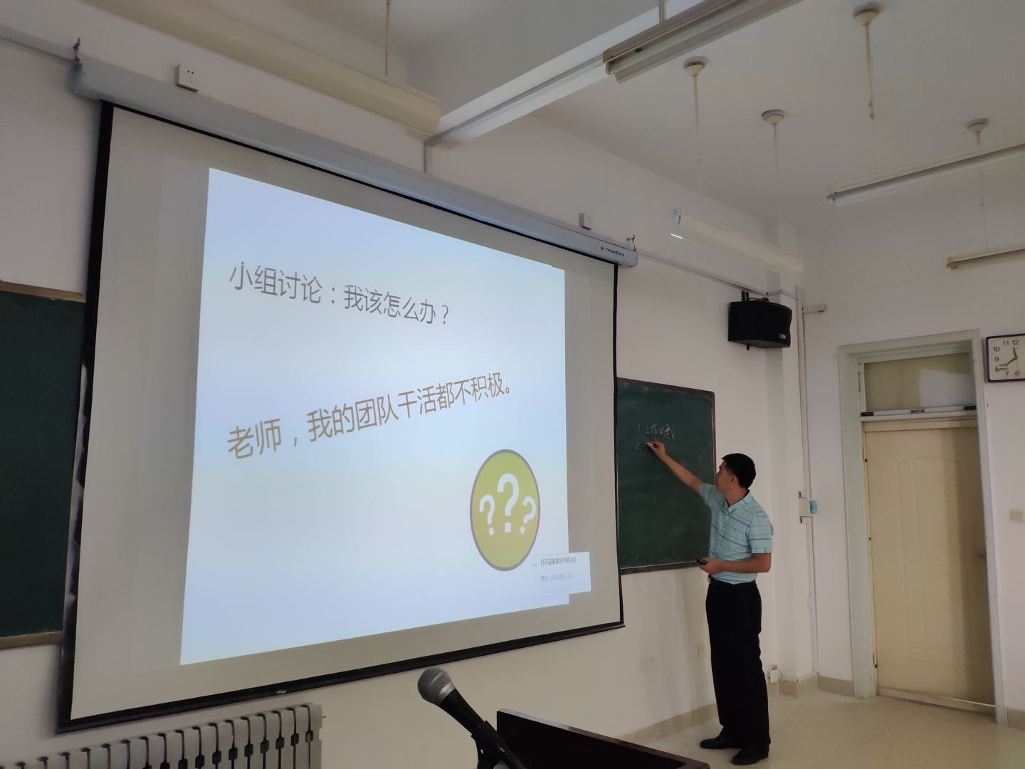 培训会开始,孙磊向科研立项队长提出问题 “团队不积极该怎么办?”,各队长分成若干个小组,互相了解小组成员过后对该问题进行讨论,每个小组派代表发言,阐述本小组对于该问题的解决方案。孙磊针对不同的人有不同的性格,对各队长进行测试,并列举几种队长和队员分别性格迥异的情况,详细地讲解了在各个情况下队长应该怎样与队员相处和交流,才能让自己的团队更加积极有活力,整体的工作效率更高。