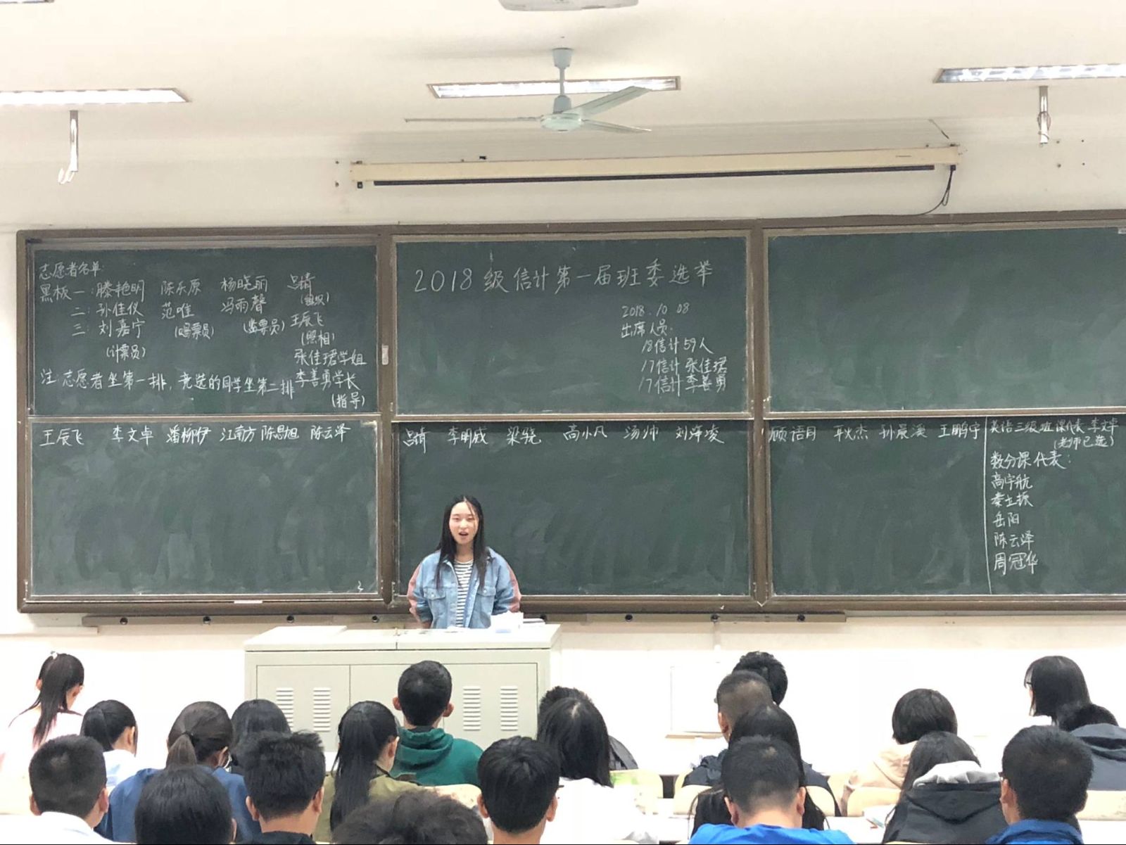 本站讯 2018年10月8日晚7点,2018级信息与计算科学班于图东326举办了首次班委选举会议,会议由团支书吕靖主持,两位班助2017级学长李善勇,2017级学姐张佳珺及全体同学参加。