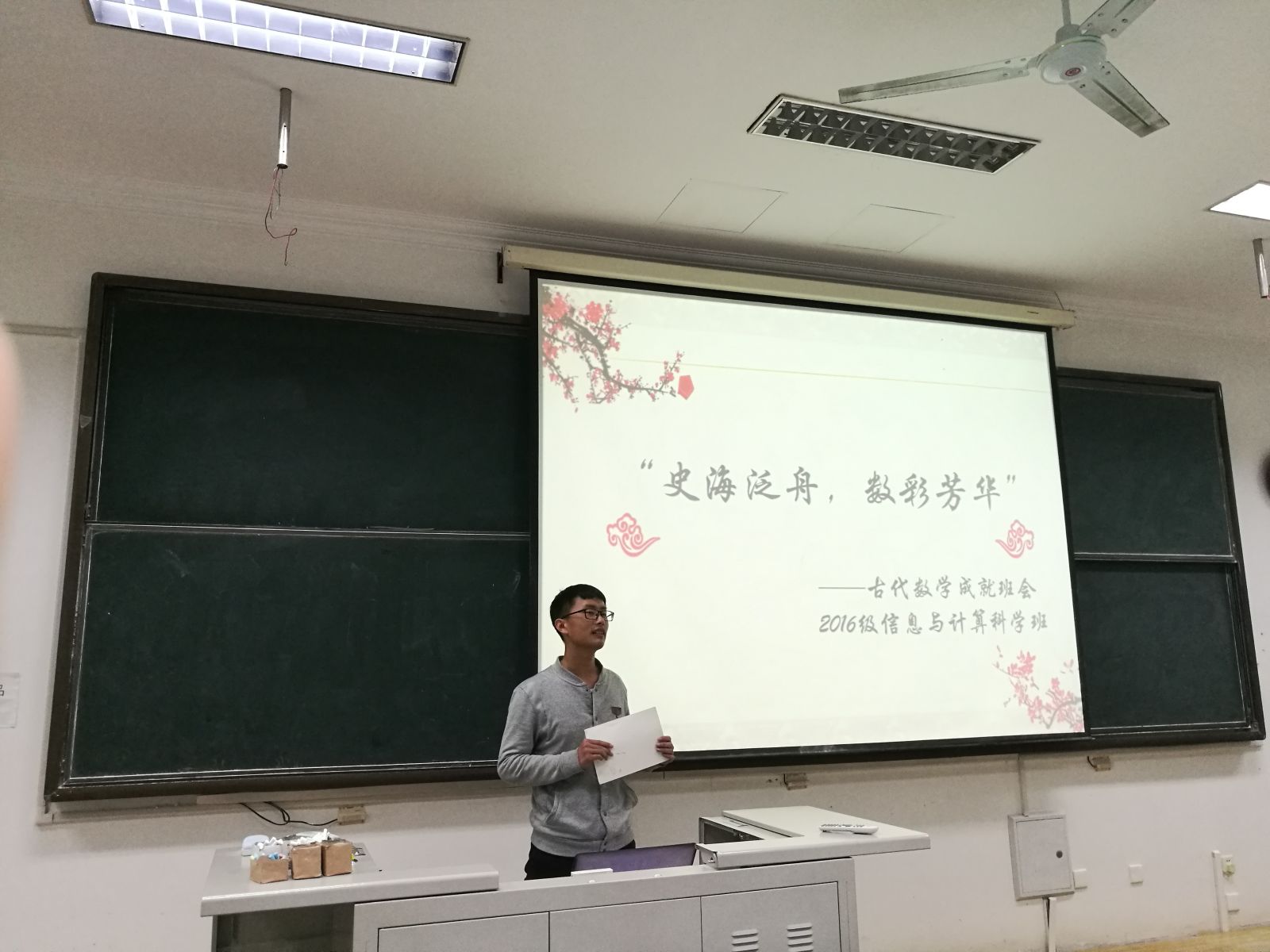 活动伊始,主持人致开场辞。随后,同学们以宿舍为单位派代表登台展示,展示主题为我国古代数学成就及与本专业的联系。同学们展示的形式多样,有PPT图文并茂、直观表达,也有在黑板上演算。比如张嘉傲同学提出了一个简单的图论问题让台下同学回答,得到了同学的积极回应。除此之外,同学们展示的内容也各有特色,有就一项突出成就进行介绍,如勾股定理、九章算术、隙积术等;有介绍我国古代的数学巨擘,比如胡文峰同学介绍的清代数学家李善兰;还有按发展史进行总体概述。在每个小组展示之后,李震同学还准备了一些趣味数学抢答题,答对的同学会获得小奖品。大家跃跃欲试,踊跃参与。其中一道“完全合算——打一数学名词”难住了不少同学,揭晓谜底为“绝对值”时,同学们恍然大悟,前仰后合。会中,赵德豪老师对本班在学习方面提出了一些要求,并给予鼓励。最后,在李震同学的总结中,本次班会落下帷幕。