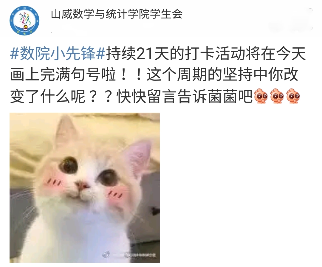 本站讯 4月5号至4月25号期间taptap点点体育学生会举办了为期21天的“数院小先锋”微博线上打卡活动,学生会全体成员参与了此次活动。