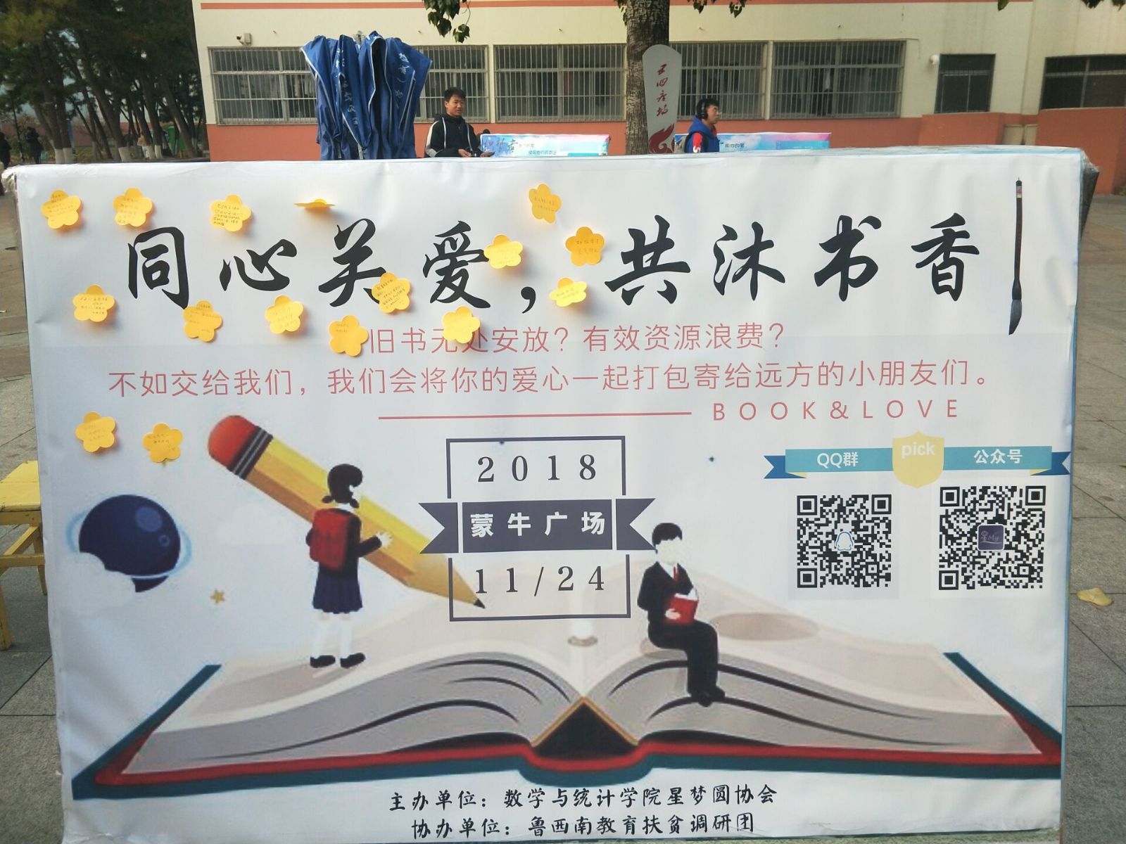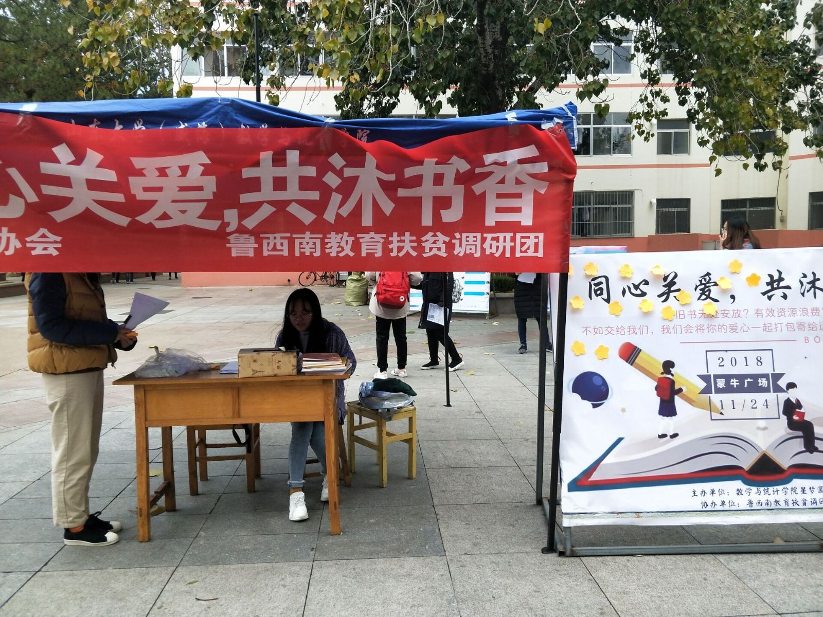 本站讯 11月24日,由我院星梦圆协会主办、鲁西南教育扶贫调研团协办的“同心关爱,共沐书香”捐书公益活动在蒙牛广场开展。星梦圆协会会长殷子涵及各部门干事参与了本次活动。