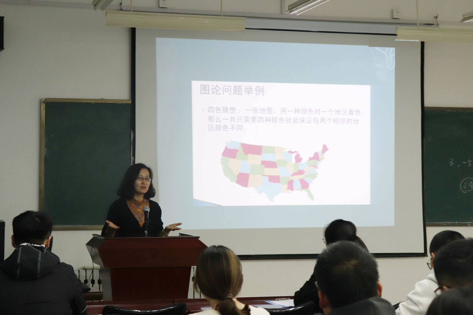 主持介绍了本次讲座的的主讲人亓兴勤教授后,讲座正式开始。亓兴勤教授以“兴苦读以深学,勤博学以弘志”为主题,结合自身的在国内外的求学经历,讲述了“勤”在数学学习中的重要性,同时从女性视角分析了学习数学学科的优势。她强调“书山有路勤为径,学海无涯苦作舟”,在数学学习过程中,“勤奋”和“潜心”是两个必不可少的条件。亓兴勤教授丰富的阅历、刻苦勤学的精神使在场的同学深受鼓舞和激励。讲座中,亓兴勤还分析了数学专业的良好前景,介绍了图论的专业背景,列举了同学们应当注重培养的基本能力。在互动环节,亓兴勤对同学们提出的问题进行了一一解答,在学习、科研、生活等方面进行了悉心指导。