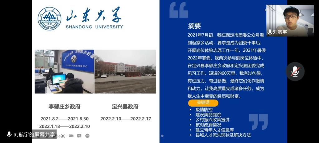 会议开始,主持人详细介绍“青鸟计划”小程序使用方法,使同学们初步认识“青鸟计划”。刘航宇从岗位寻找、岗位体验、结题报告撰写及后期答辩等方面为同学们展开就业见习的相关介绍,并在简历撰写及面试方面给出同学几点建议,强调简历上的个人经历要真实,自我评价要中肯,并应辅以佐证;张晓涵从自身实习经历出发,讲解自己实习岗位的寻找过程以及在岗位处理的各项工作,带同学们深入了解社区基层工作,介绍自己的实习vlog,并为同学们带来了个人答辩感悟及相关技巧分享。她认为在答辩过程中要把握好自己的节奏,冷静处理突发情况,从而让同学们对于答辩过程有更深层次的了解。