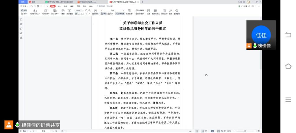 会议上,魏佳佳逐条传达《关于学联学生会工作人员改进作风服务同学的若干规定》对学生骨干的要求,结合具体事例及工作经验指导工作,指出学生骨干工作过程中可能存在的问题及相关注意事项。同时她强调,学团组织是一个有温度的集体,需要有温度地工作,各部门成员之间要在主席团的带领下统筹协作,摒弃庸俗的习气,踏实落实“全心全意为同学服务”的宗旨。此外,魏佳佳还向学生骨干传达了几点期望:希望学生骨干强化精品意识、细节意识;合理分配时间,协调好工作与学习,做到长计划短安排;锻炼良好沟通能力,正确处理人际交往;执行有力,反馈迅速,切中事物关键;以人为镜,在共同工作中取长补短,不断提升自我等。院团委书记孙磊最后总结:学生干部不仅要增强工作能力,还要提高责任意识,学生干部代表的不仅是个人,更代表学生组织和学院集体,学生干部要严于律己,时刻保持个人优良作风。