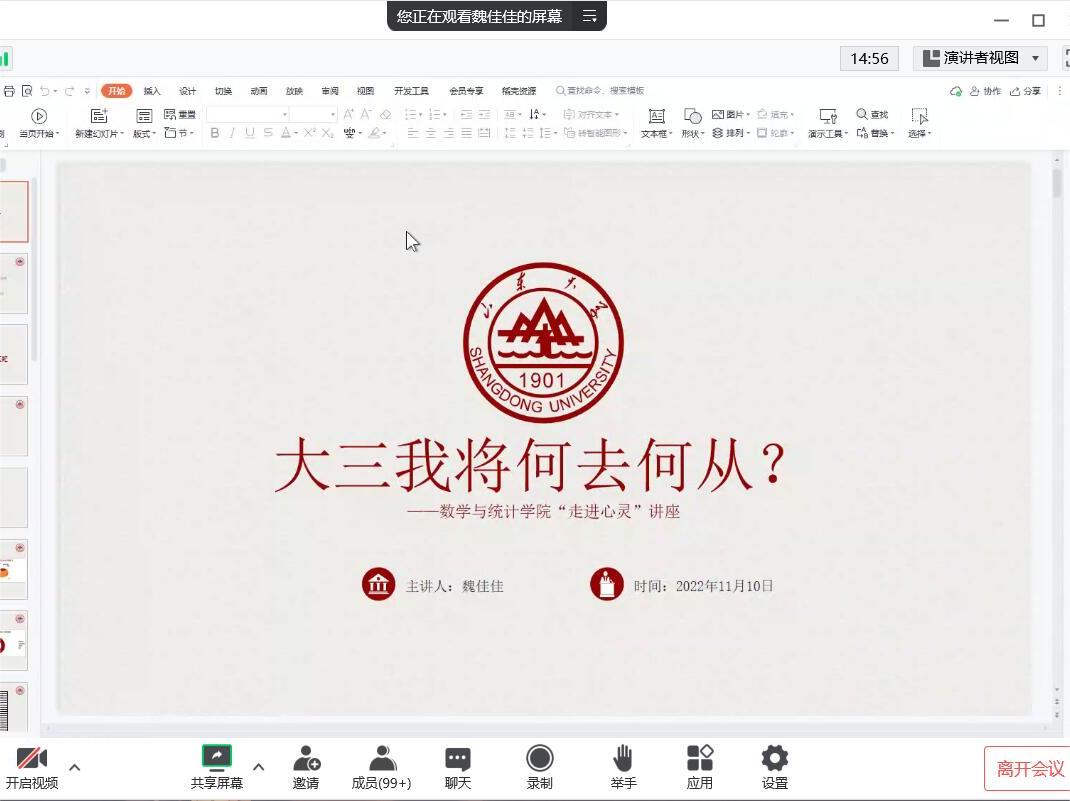 魏佳佳首先分享了目标选择的重要性。她讲到学生需要对当下的自己做出觉察和分析,了解自己的学业表现、个人品质、综合能力等客观条件,思考从当下出发,未来可以确定的目标和选择。她结合往届学生的就业情况,分析了未来就业、保研、考研、出国等方向的选择,并着重分享了每种选择需要付出的努力和做出的准备。她提出,大三是一个承前启后的阶段,也是一个亡羊补牢的关键期更是未来巨大就业压力的缓冲期和能力储备期。这个时期,作为学生要充分做好知识储备,广泛获取就业信息,以职业发展为导向有的放矢去扩充基础知识、增加实习经验、获取外部世界信息。她提醒同学们可以及时关注国家政策和山东大学就业信息网,放宽眼界,抓住机遇。面对部分同学在现阶段的焦虑和迷茫情绪,她鼓励同学们坚定目标,做好时间管理,用行动治焦虑,用了解治迷茫,树立信心,提升自我效能感。