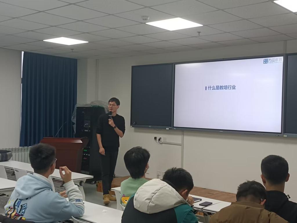 本站讯 12月11日下午,taptap点点体育于北衡楼1420室举办本学期第三期“名企名家进校园”讲座。方田教育运营总监徐旭以 “论教育行业发展,谈未来职业规划”为主题进行讲座。方田教育人事经理徐成诺及70余名学生到场聆听讲座。本次讲座由学院辅导员赵宇轩主持。