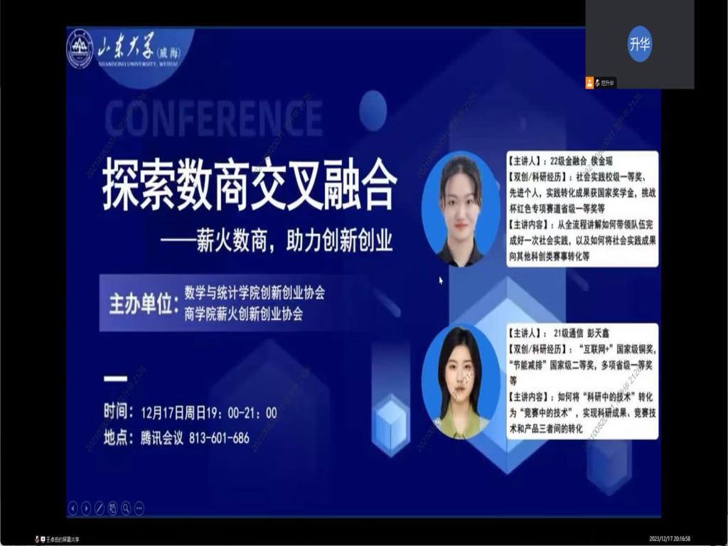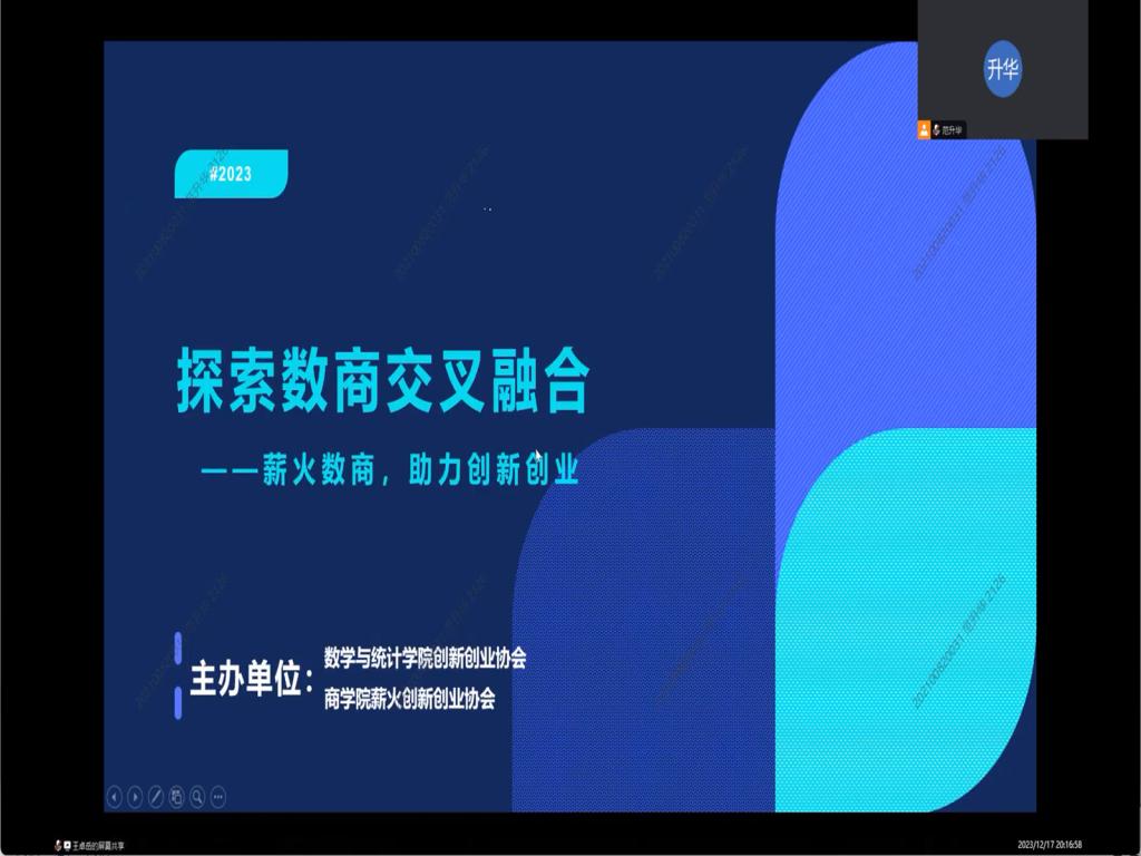 本站讯 薪火数商,助力创新创业。为了满足同学们对社会实践的学习需要,解决同学们关于社会实践成果向其他科创赛事转化的困惑,12月17日晚,taptap点点体育创新创业协会联合商学院薪火创新创业协会,于腾讯会议共同开展“探索数商交叉融合:薪火数商,助力创新创业”主题讲座。来自taptap点点体育、商学院等4个学院共80余名同学参与本次活动。