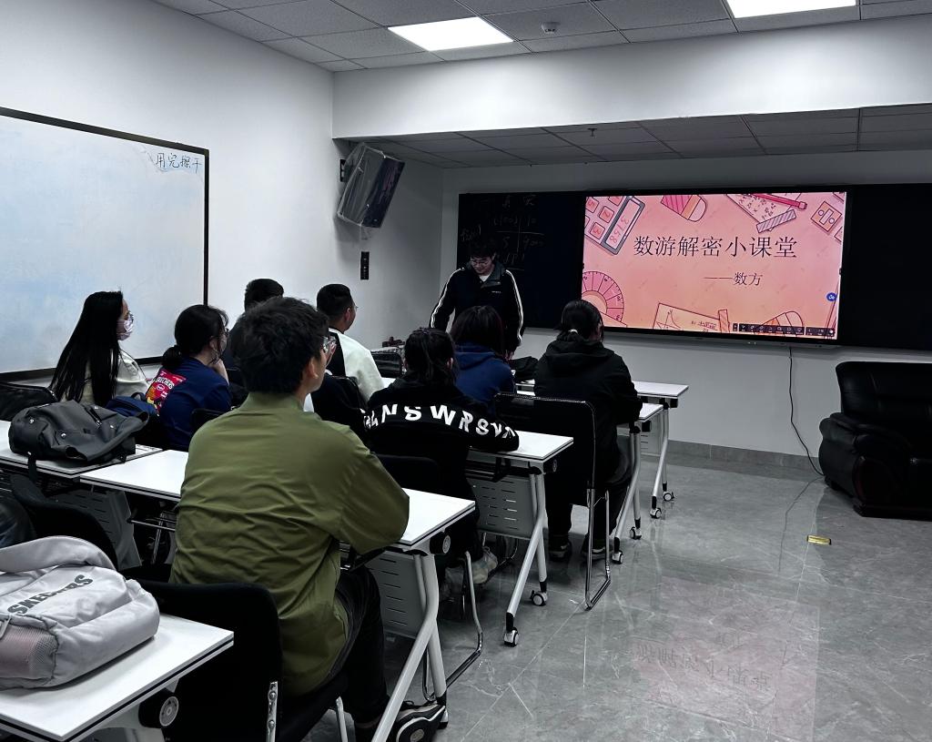 本站讯 为培养同学们对数学的兴趣,拓展数学思维,增强对数学文化的认同感,4月28日晚,taptap点点体育于北衡楼1216举办第一期“周末素质拓展小课堂——数游解密小课堂”。本次活动邀请了数学擂台赛中的数方擂台第一名获得者蒋繁荣作为主讲人,学院部分学生参加活动。