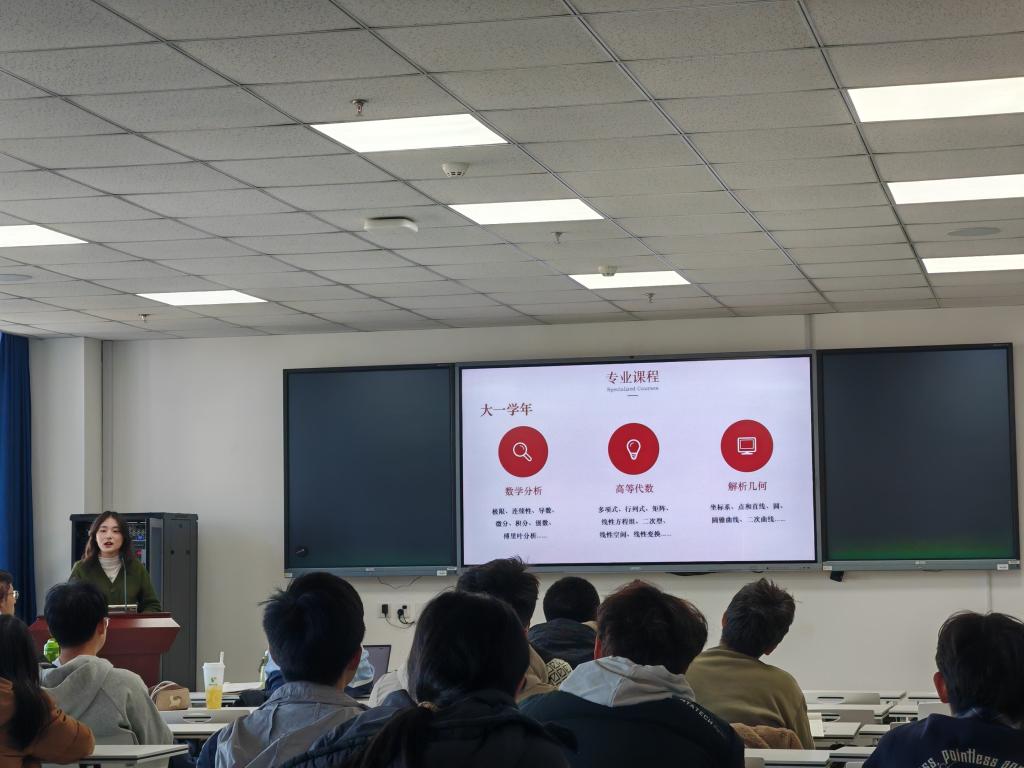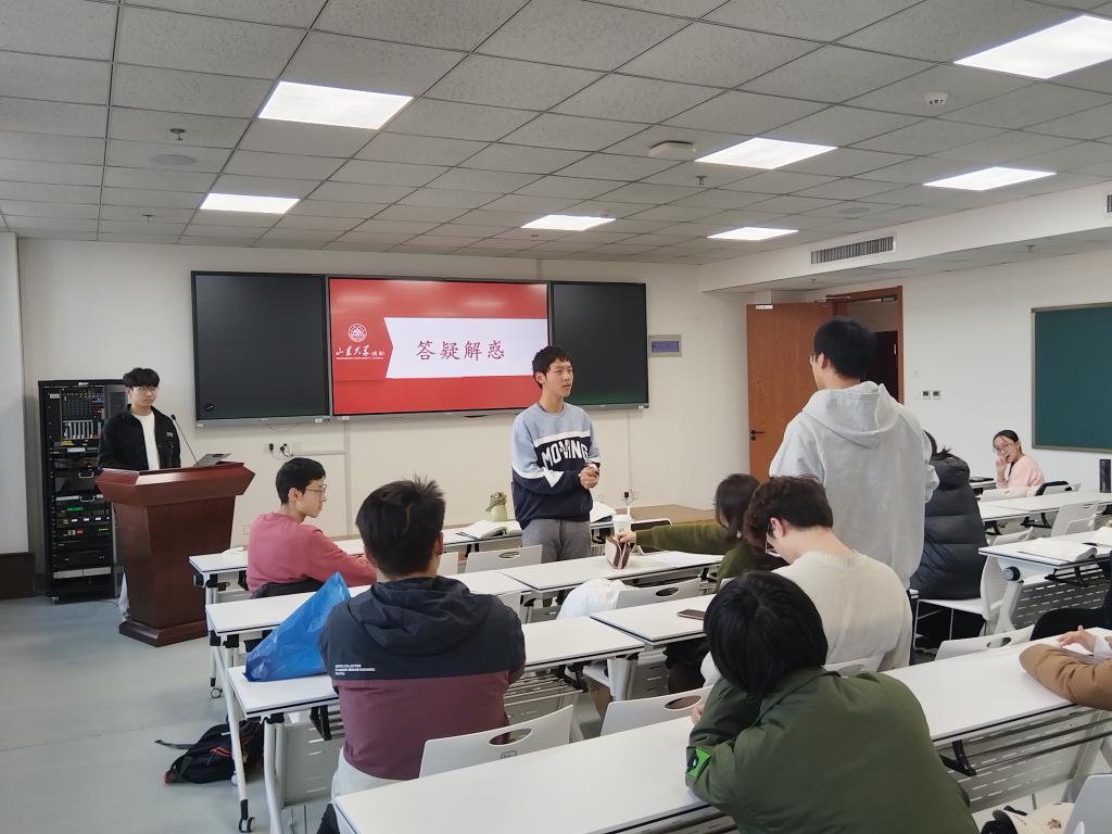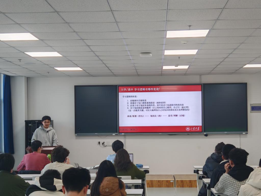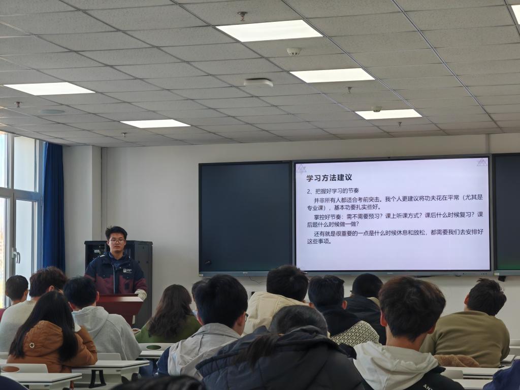 本次活动中,蔡可心从专业课程笔记整理、思政课程学习思路、英语四六级通关攻略、期末考试备考方法四个方面展开分享,介绍了日常学习和考试复习的实用方法。何劭康根据自身的学习经历给出专业基础课程的学习建议,他认为学习数学需要自觉进行思维训练,养成良好的思维习惯,还需要把握学习节奏,做到学前预习、学后复习,形成闭环,夯实专业基础。李瑞洲从高中与大学学习生活的区别出发,建议同学们要有较强的自驱力,重视课程体系的搭建和所学知识的内化,并结合课程考核分数构成情况给出详细备考建议。互动环节中,同学们结合自身情况踊跃提问,三位分享人进行了详细解答。