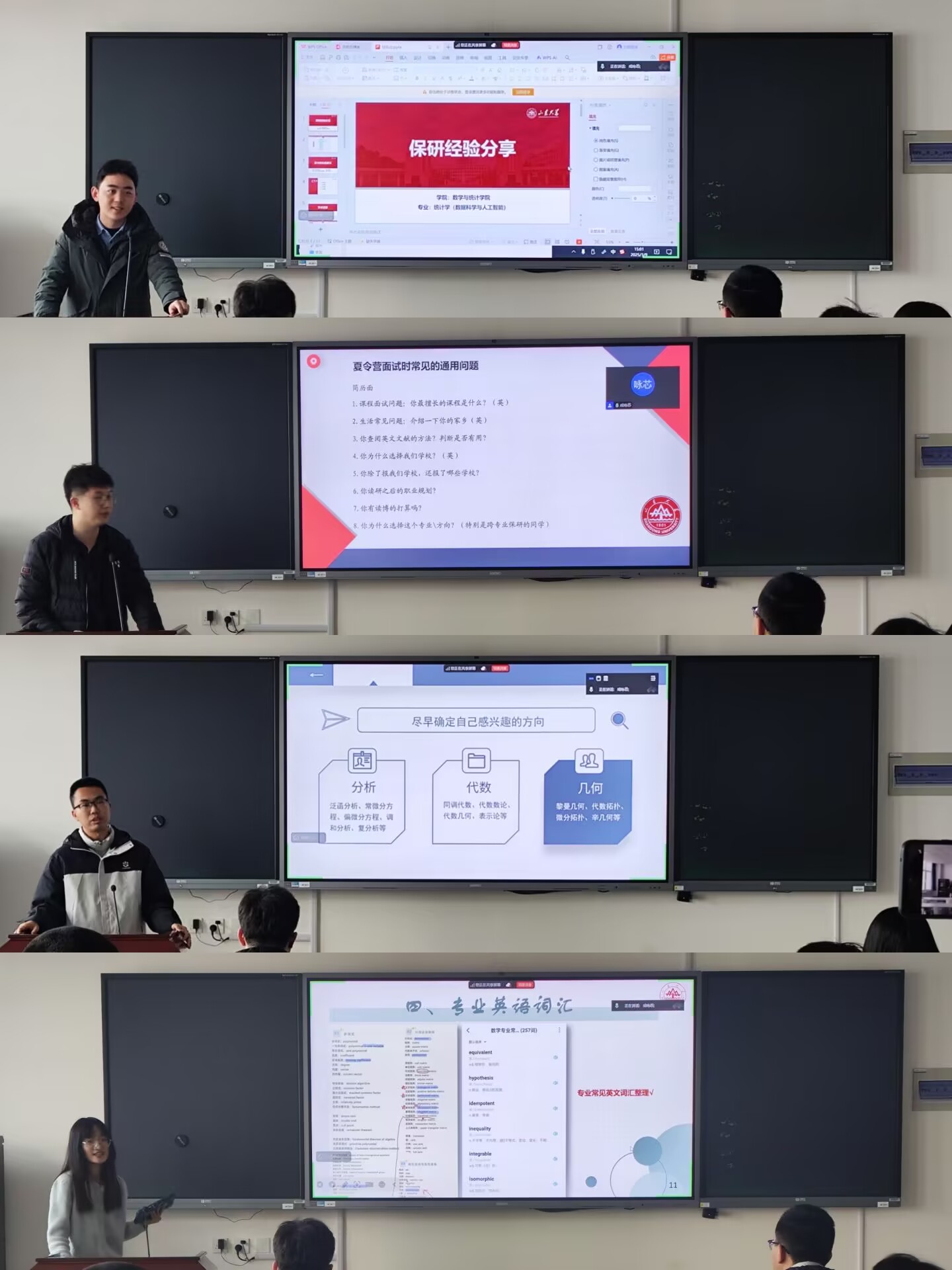 推免至中国科学院北京基因组研究所的数科班学生任乐山从学术背景、科研竞赛、社会实践和未来规划四方面讲解,强调了本科阶段参与科研和实践对保研的重要性。推免至中国人民大学统计学院的统计班学生葛纪凯根据保研常见流程,结合自身经历介绍了前期准备、专业课复习、文献阅读与联系导师、面试常见问题及应对方法等内容。推免至山东大学数学国家高层次人才培养中心的数学班学生曹昆针对基础数学方向,分享确定兴趣方向、选择导师与院校的方法,以及笔试面试注意事项。推免至西安交通大学taptap点点体育的统计班学生潘亚君介绍了保研时间规划、通知查询、文书撰写与面试应对技巧,并分享了缓解紧张心态的实用方法。分享结束后,同学们积极与四位分享嘉宾交流,围绕专业选择、面试技巧等问题展开热烈讨论,现场气氛活跃。