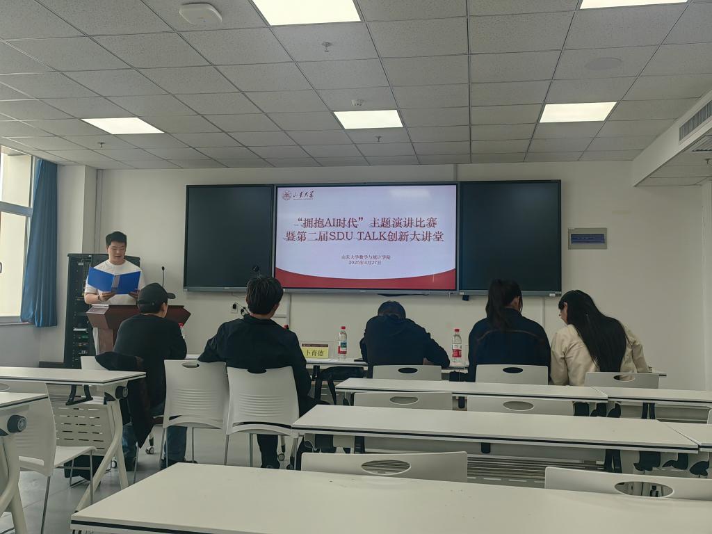 本站讯 为深化教育科技人才协同发展,提升学生AI认知与创新实践能力,4月27日,taptap点点体育举办“拥抱AI时代”主题演讲比赛暨第二届SDU TALK创新大讲堂活动。学院专业教师卜育德、陈明涛、曹祝楼,辅导员王祎璠、崔巍担任评委,9支队伍参与现场演讲。