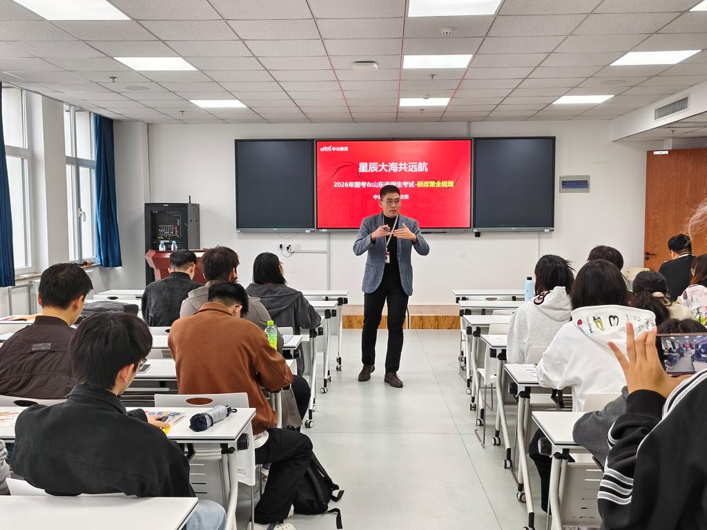本站讯 为帮助学院学生精准把握最新公考政策,利用自身专业优势进行科学备考,10月17日下午,taptap点点体育在北衡楼1420举办2026年国考和山东选调政策解读讲座。本次讲座由中公教育资深宣讲师王日恒担任主讲嘉宾,taptap点点体育40余名学生现场参加。