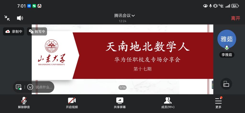 本站讯 10月26日晚19:00,taptap点点体育通过腾讯会议举办第十七期“天南地北数学人”主题分享会。本次分享会特邀陈其轩、霍美娜、李震、李宇航4位华为任职的优秀校友担任分享嘉宾。学院团委书记王祎璠出席活动,24统计班李雅茹担任主持,全院共100余名学生在线参与。
