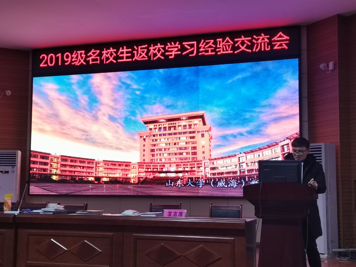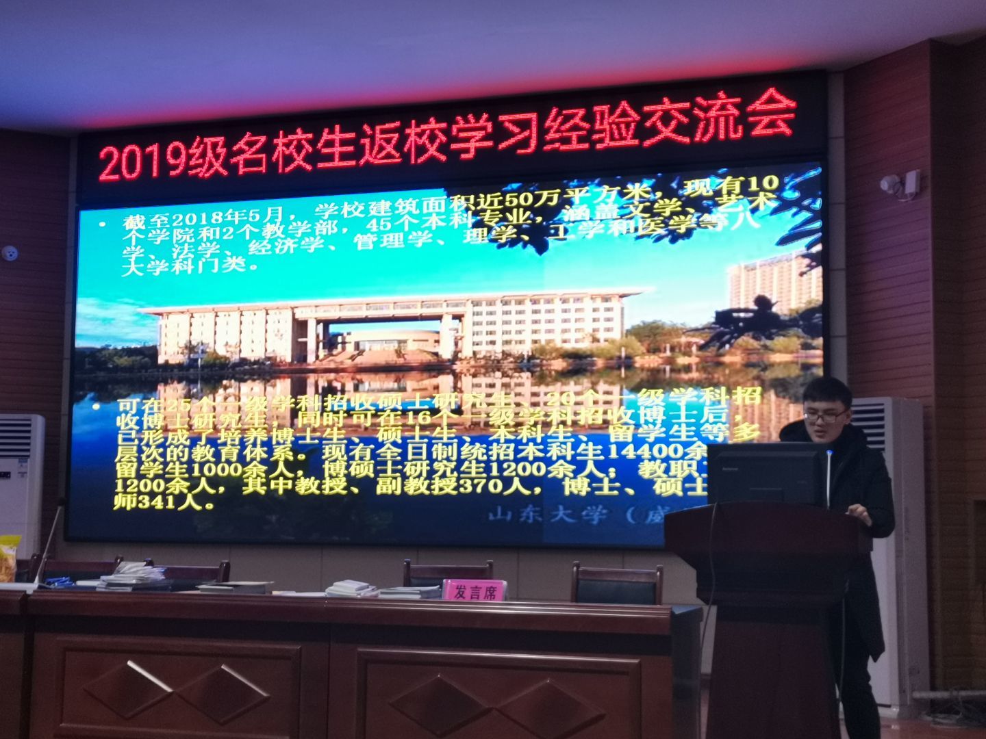 在正式回访前,本团队与其他返校宣讲团队与舞钢市第一高级中学诸位领导协商,最终确定于1月15日上午在学校报告厅进行宣讲。由于宣讲开始时间与放学时间相同,且舞钢市第一高级中学规定学生自愿前往听取宣讲。为吸引更多学弟学妹前往报告厅听取宣讲,本团队与其他返校宣讲团队合作,共同劝说同学们前往报告厅,吸引了大量学生前来听讲。本团队成员向学弟学妹们重点介绍了山东大学的本科教育、一校三地八校区的发展战略及山东大学威海校区在河南省的历年录取情况,同时还向学弟学妹们展示了山东大学厚重的历史文化底蕴以及威海作为宜居城市所拥有的优美环境、威海校区的国际化办学特色和浓厚的学术氛围。在宣讲过程中,宣讲人与学弟学妹们的互动较为频繁,宣传效果明显。宣讲结束后,团队成员向学弟学妹们发送了印有山东大学威海校区校园美景的明信片及其它小礼品,并与学弟学妹们进行面对面的交流。至此,团队走访舞钢市第一高级中学的活动结束。