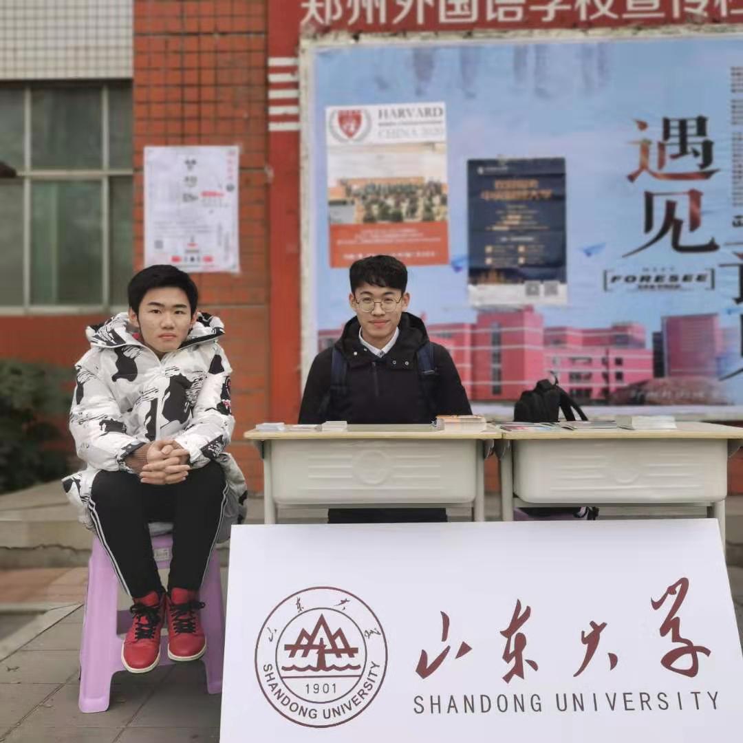 宣讲开始之前,团队联系郑州外国语学校宣讲总负责人宁悦玥,具体对宣讲时间及地点作详细安排,并提前定制山大明信片等纪念品、制作山东大学(威海)条幅等,充分做好前期保障工作。在宣讲过程中,队员与咨询的同学们交谈十分融洽,问题的询问与解答衔接良好。对于同学们提出的相关问题,队员们分条分问题给予了详细的答复与介绍,并且还将2019年山东大学(威海)高考招生简章发放给同学们做进一步的了解咨询。本次宣讲分为三个板块,分别为进班宣讲、主干道宣讲和礼堂分专业宣讲。我队与山东大学软件园校区、青岛校区和趵突泉校区的同学积极配合、协同工作,顺利完成了在郑州外国语学校的宣讲工作。