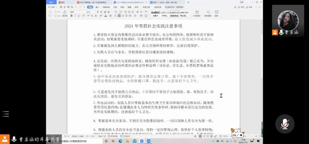 会议伊始,王紫山就今年寒假社会实践的具体情况对疫情防控的相关工作进行了强调,要求参与社会实践的成员非必要不得开展跨市活动,减少人员聚集,以成员的安全为首要考虑因素;并鼓励其对社会实践调研形式进行创新,充分利用线上资源,开展云问卷、云调研、云实践,同时需要做好个人防控,坚持佩戴口罩,听从相关指导老师的安排,每日进行安全情况汇报。其次,实践服务部成员带领各社会实践团队队长对《山东大学新冠肺炎疫情常态化防控下学生管理暂行规定学习》进行了分析与学习,补充强调了寒假社会实践的其他注意事项,增强实践人员的安全自卫意识,使其掌握基本安全常识,保持警惕心理,确保自身安全。