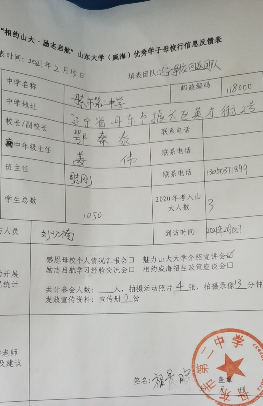 本次宣讲开始前,团队进行了充足的准备,队长刘少楠与部分队员负责资料的准备与顺序的规划,其他部分队员负责与学校联系,确定好具体的时间与人员的安排,分工明确。在PPT中,团队准备了一个短视频,包括山东大学的历史与现状,一校三地的样貌与山东大学综合实力的突显。这些内容有助于同学们更好地了解山东大学,使他们明白山东大学的实力与优势,更是着重介绍了山东大学威海校区的中外合作办学的政策与好处,获得了丹东二中同学们的好评。结束宣讲后,团队把PPT和视频以及山东大学的二维码,相关联系方式等留在了群里,便于日后的联系。