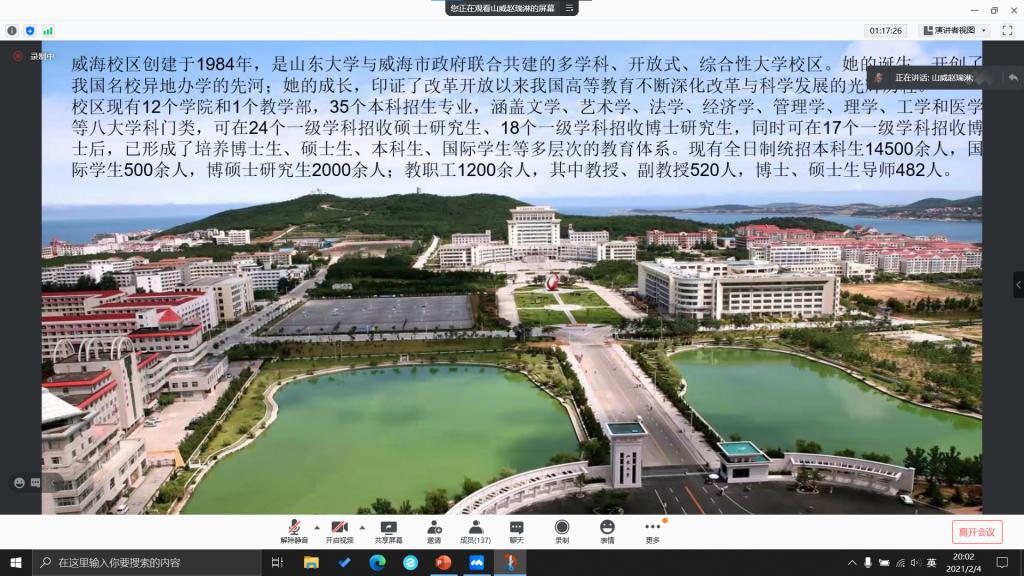 本站讯 2月4日,辽宁返母校团队参加了东北育才学校高中部开展的高校招生宣讲会,此次宣讲以腾讯会议和bilibili直播的方式。山东大学的宣讲部分由队长刘少楠组织策划,队员李明睿以及山东大学刘博宇和山东大学(威海)赵瑞淋联合主持。本场宣讲的主要目的是帮助东北育才学校的学生更好地了解山东大学。