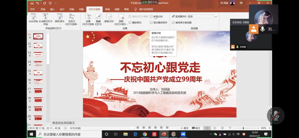 本站讯 为庆祝中国共产党成立99周年,重温光荣传统,宣扬时代精神,2018级数据科学班于7月1日下午举办“不忘初心跟党走”庆祝中国共产党成立99周年党建主题班会。本次活动由团支部书记刘润迪主持。全体同学参加了此次会议。