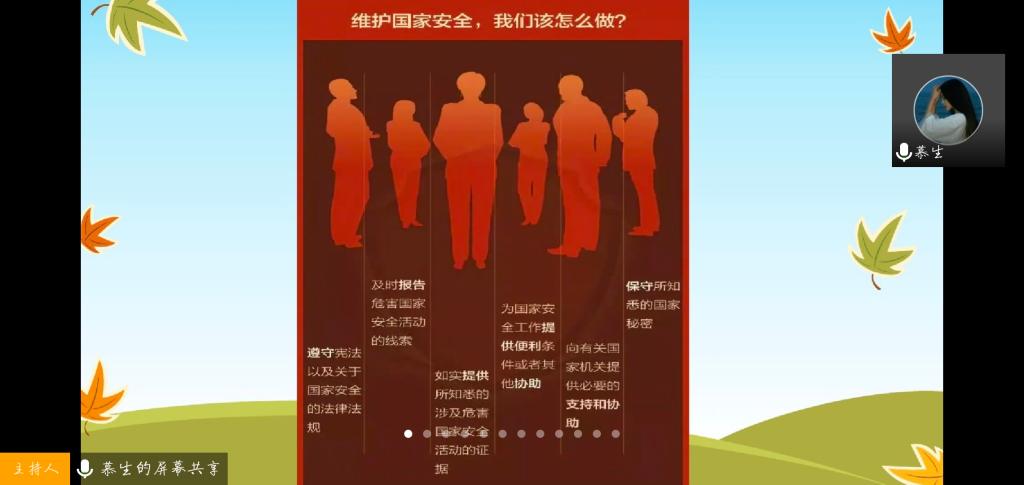 国家安全是国家生存和发展的前提、是人民安居乐业的基础。就此,团支书秦千从国家安全的定义及相关法律规定等各方面向同学们全面介绍了国家安全的有关知识,让国家安全知识入校园。首先,团支书为同学们详细讲解了“什么是国家安全”、“国家安全包括哪些方面”以及国家安全法的规定,旨在让同学们了解更多国家安全的常识。紧接着,团支书又以实际案例向同学们进一步说明国家安全就在我们身边,保护国家安全人人有责。最后,团支书秦千向同学们介绍了作为当代大学生应如何维护国家安全,告诫同学们应自觉履行保护国家秘密、维护国家安全的责任,增强了同学们的责任意识。